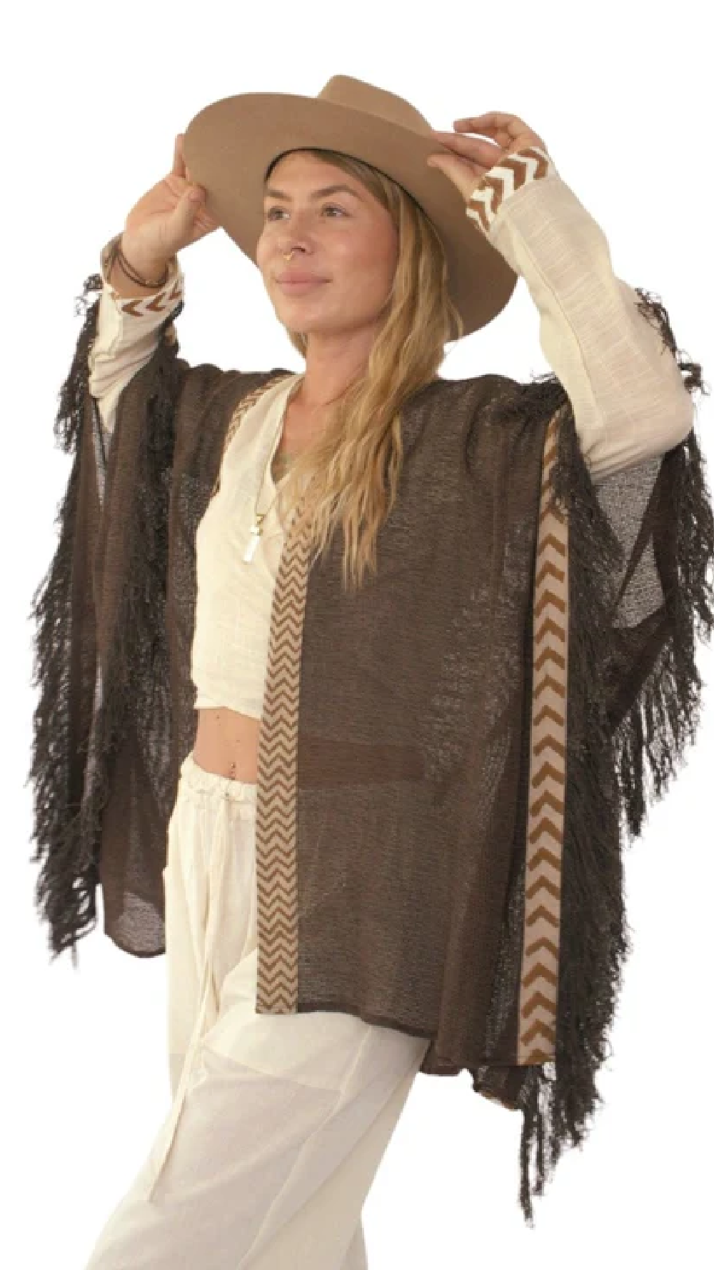 Unleash your inner free spirit and let the wind whisper through your soul with our Organic Cotton Open Poncho with Fringe. This playful piece is a marriage of comfort, style, and effortless bohemian vibes. Crafted from luxuriously soft organic cotton mesh, it offers a cool, breathable layer that drapes beautifully and moves with you.