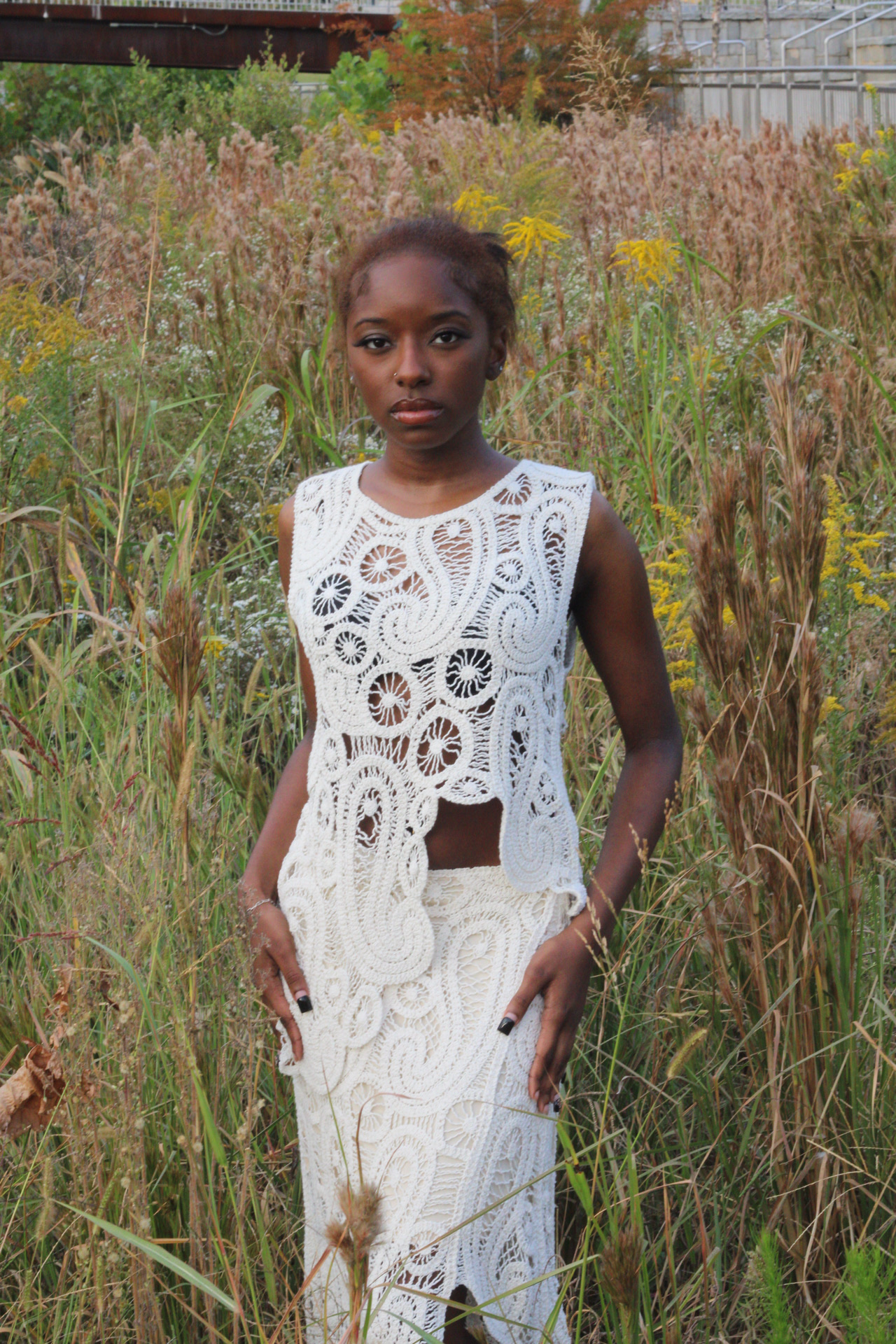 A two-piece set with a sleeveless crochet lace top and matching high-waisted skirt, showcasing intricate patterns and a sophisticated, bohemian style.