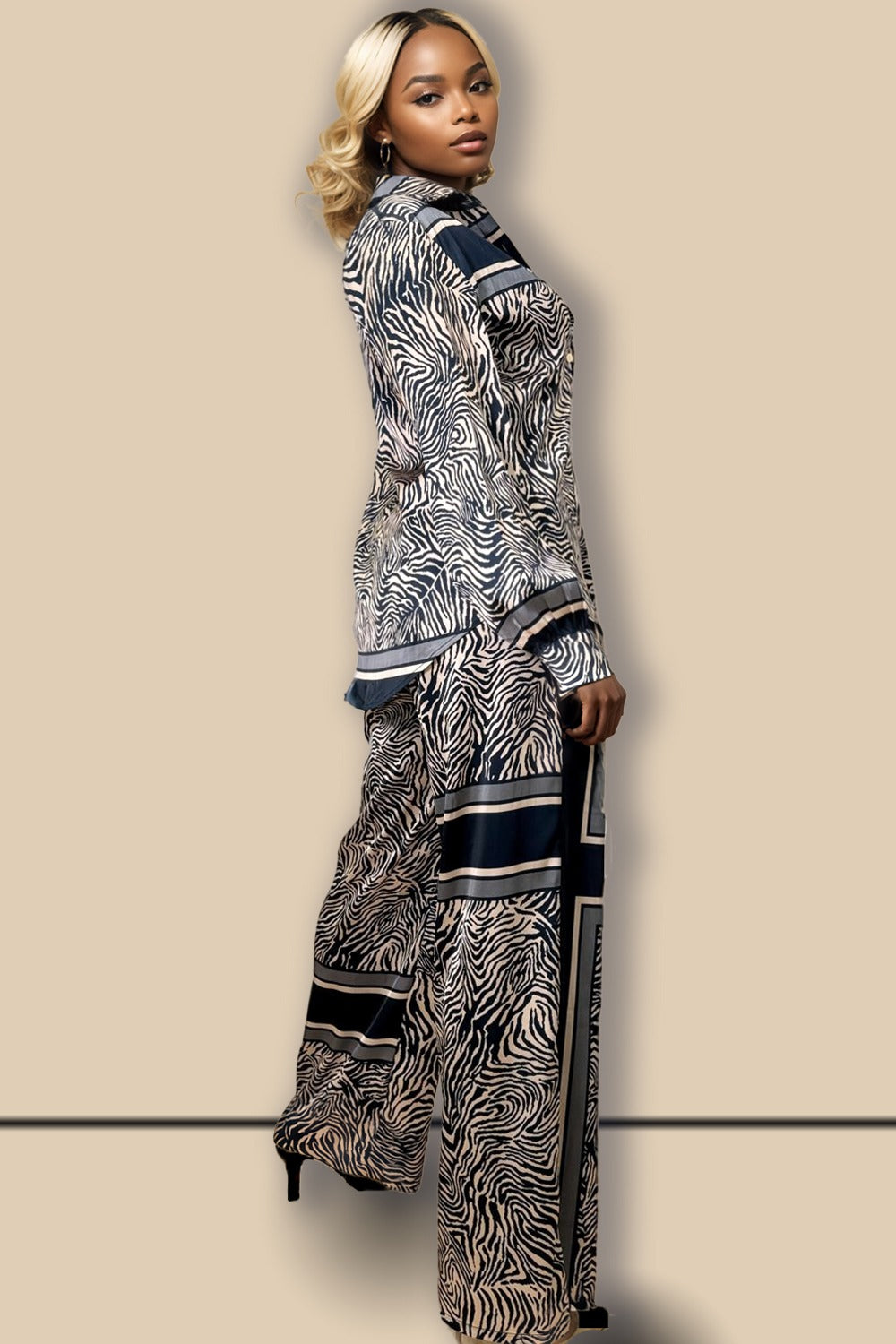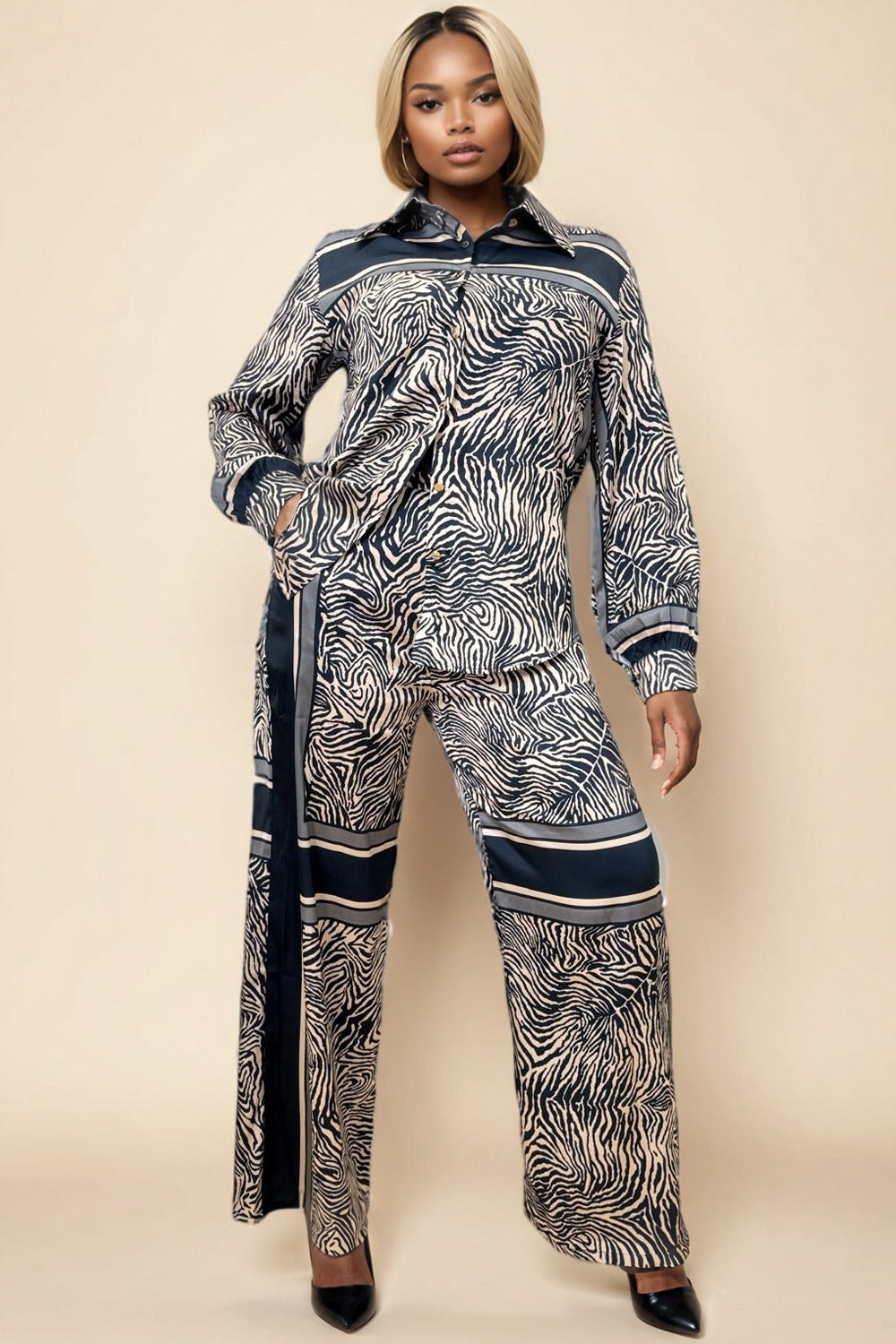 Crafted from silky fabric, this set features a stylish palazzo pant with an elastic waistband, front zipper and button. It includes a button-down top with long cuffed sleeves and gold buttons, offering both style and comfort. It runs big from s-xxxL, perfect for full-figure!