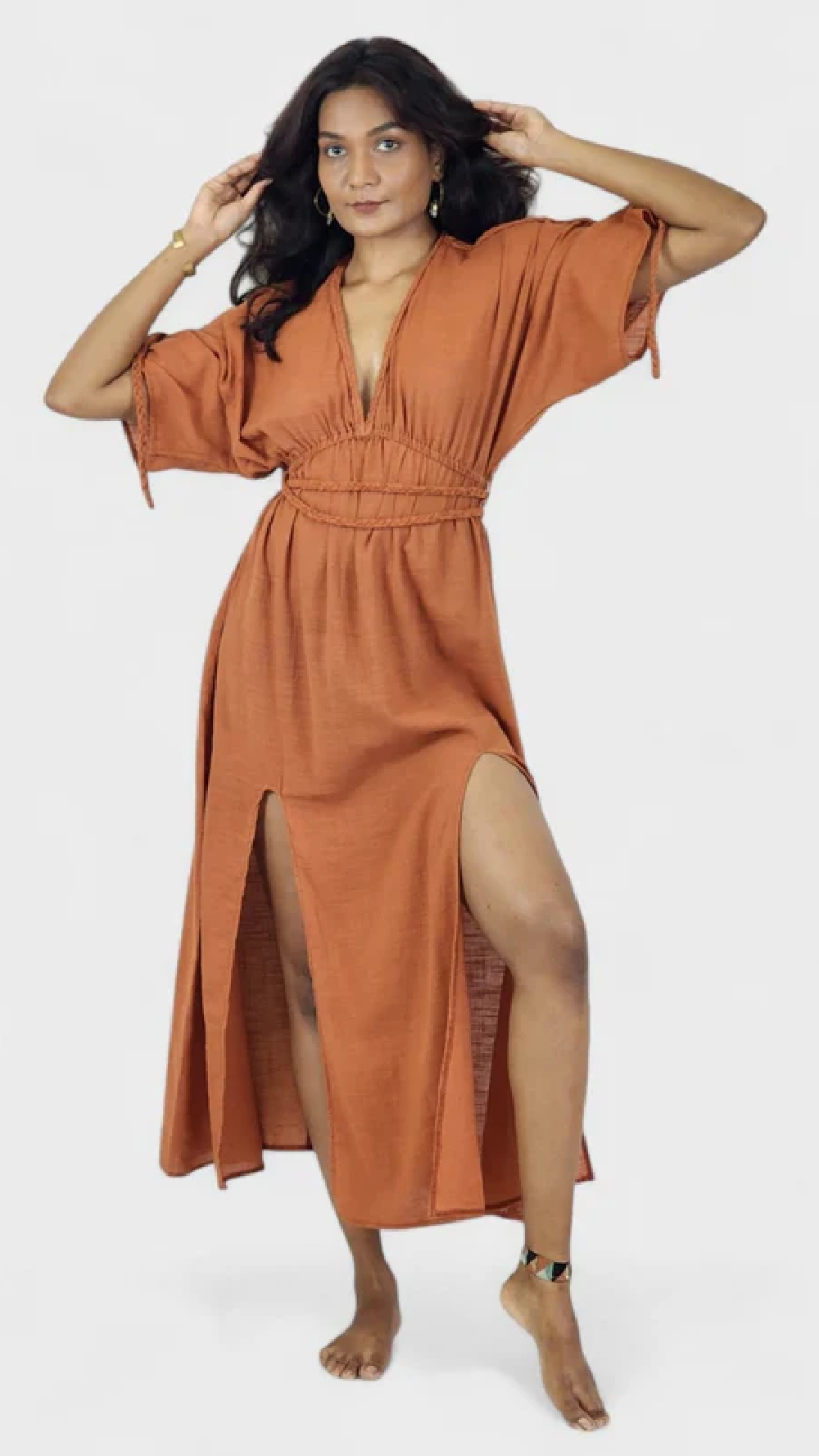 The design features an intricate rope detail that cinches the waist and enhances your silhouette, creating a flattering, flowy effect that exudes confidence and grace. The plunging neckline and adjustable rope straps provide a customizable fit, while the skirt flows beautifully with two slits on each side, offering a sense of freedom and movement.